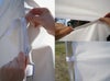 天幕と同じ生地を使用しており、1方幕から4方幕まで環境に応じてご使用いただけます。取り付けは天幕にマジックテープで貼り付け・連結はファスナーで行うため時間がかからず簡単に設置が可能です。