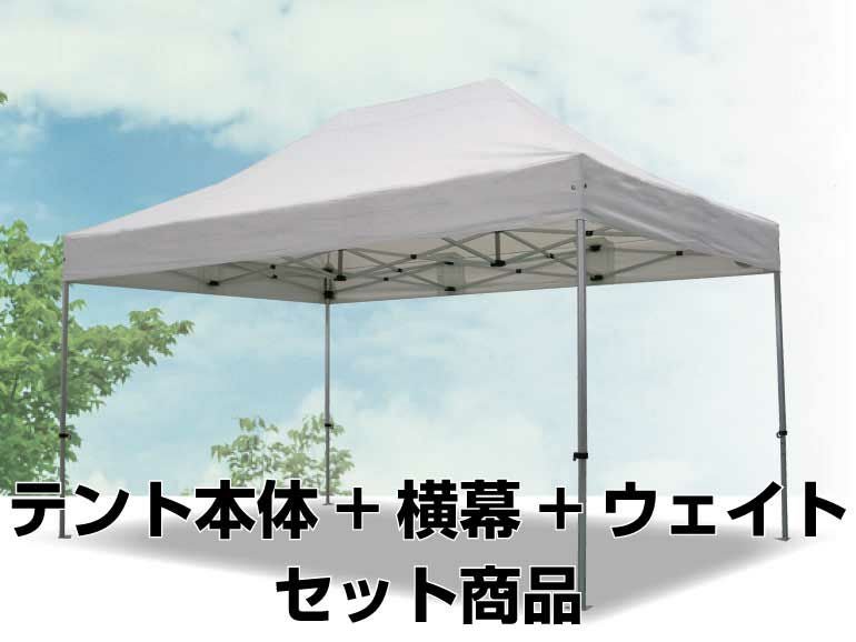 風対策に使用するウェイトは鋳物の20kgウェイトです。3m×4.5mセットには4個付属します。 横幕はファスナーで簡単に連結ができるので使用状況により横幕の着脱が可能です。